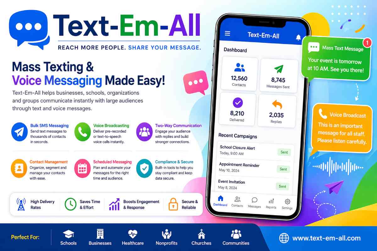 Given today’s emphasis on instant communication for greatest reach and effectiveness, companies and groups are exploring the use of bulk messaging. One of the many options is Text-Em-All, which gives anyone the ability to send SMS text and voice messages to a large group quickly (within seconds). Whether your organization is a school sending out announcements, a doctor’s office sending a reminder, or a business alerting its employees, it can use Text-Em-All to connect with others without needing tech knowledge.